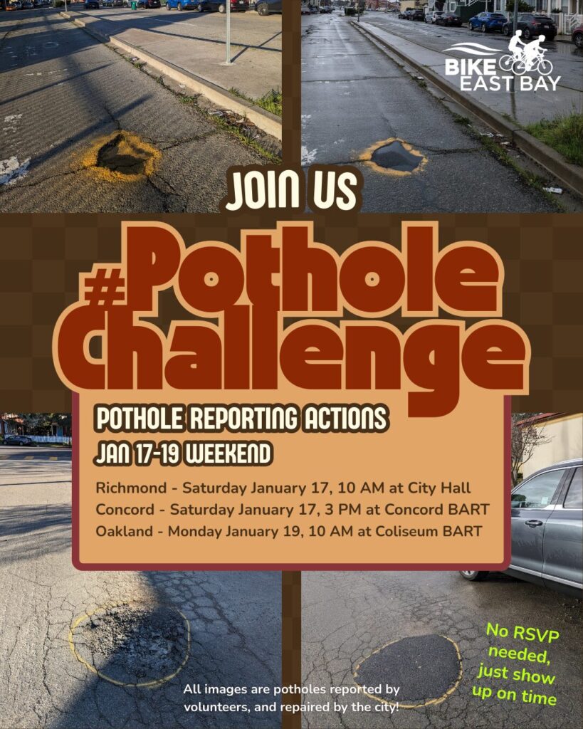 Did you know January 15 is National Pothole Day? People who drive, bike, walk, and city officials all agree that potholes are dangerous, frustrating hazards that cause injury and expensive damage. The #PotholeChallenge is Bike East Bay’s way to encourage individual, direct action in making a difference in your city during the week of January 12-19.
