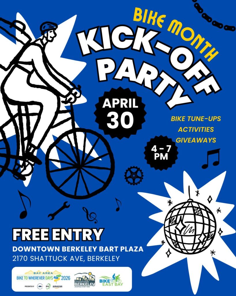 Kick off Bike Month festivities with Bike East Bay! Join us at the Downtown Berkeley BART Plaza on April 30th from 4-7 PM for an afternoon of biking celebration.