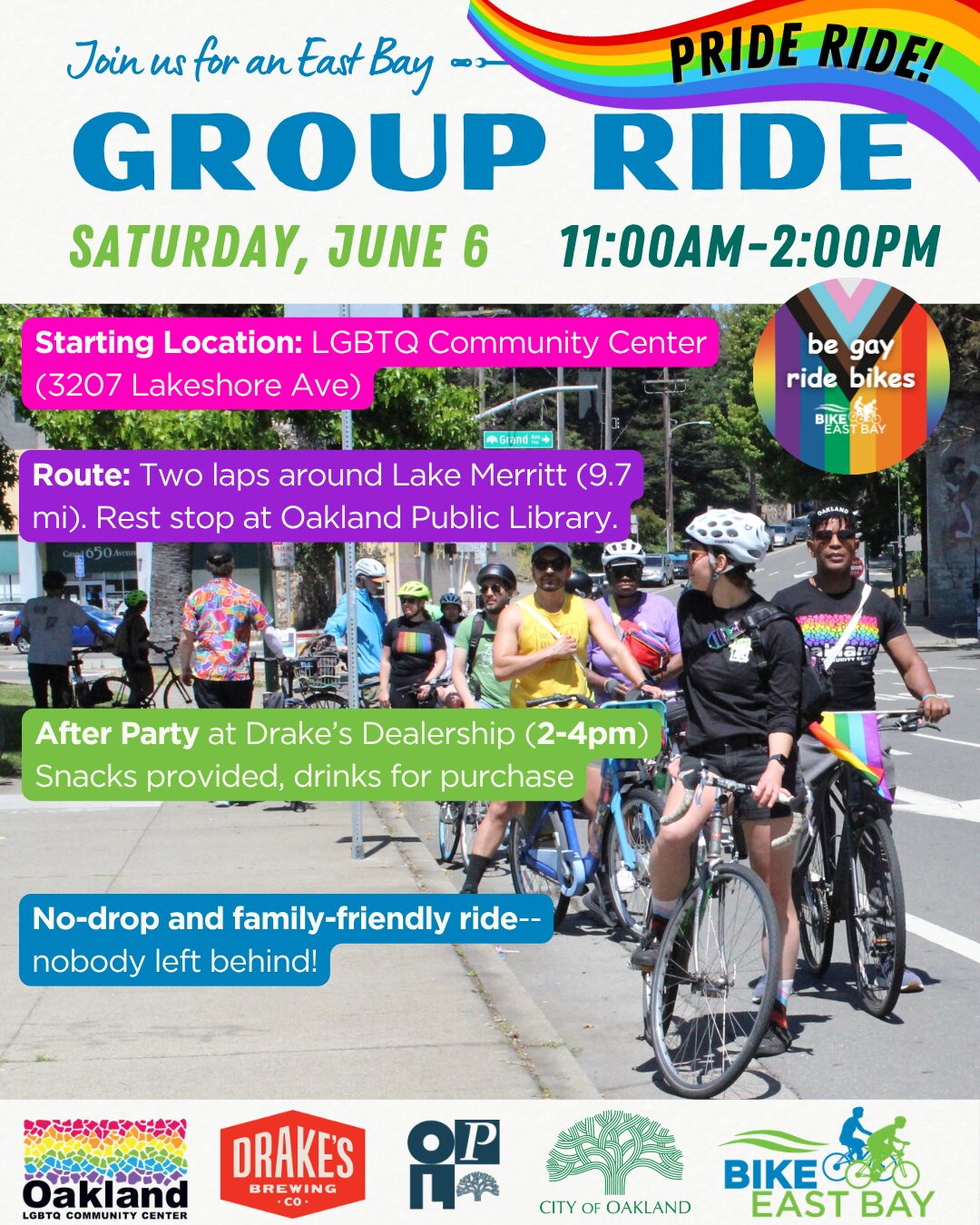 Jun 6 Bike East Bay Group Ride Series: Lake Merritt Pride Ride 11:00 am - 2:00 pm Group Rides Oakland LGBTQ Community Center 3207 Lakeshore Ave, Oakland Event Details Get Directions