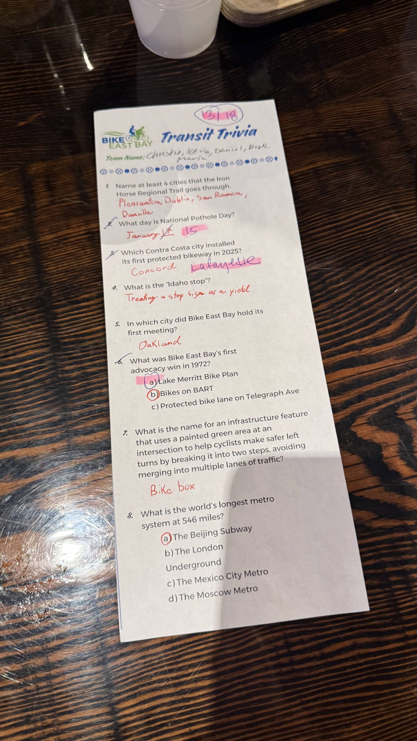 We closed out the event with a massive group photo, a few extra slices of pizza, and then a couple dozen folks headed over to Cornerstone with us to compete in our 2nd annual game of “Transit Trivia.” Drinks poured, prizes were distributed, and the difficulty level of our trivia questions brought out some friendly competition.